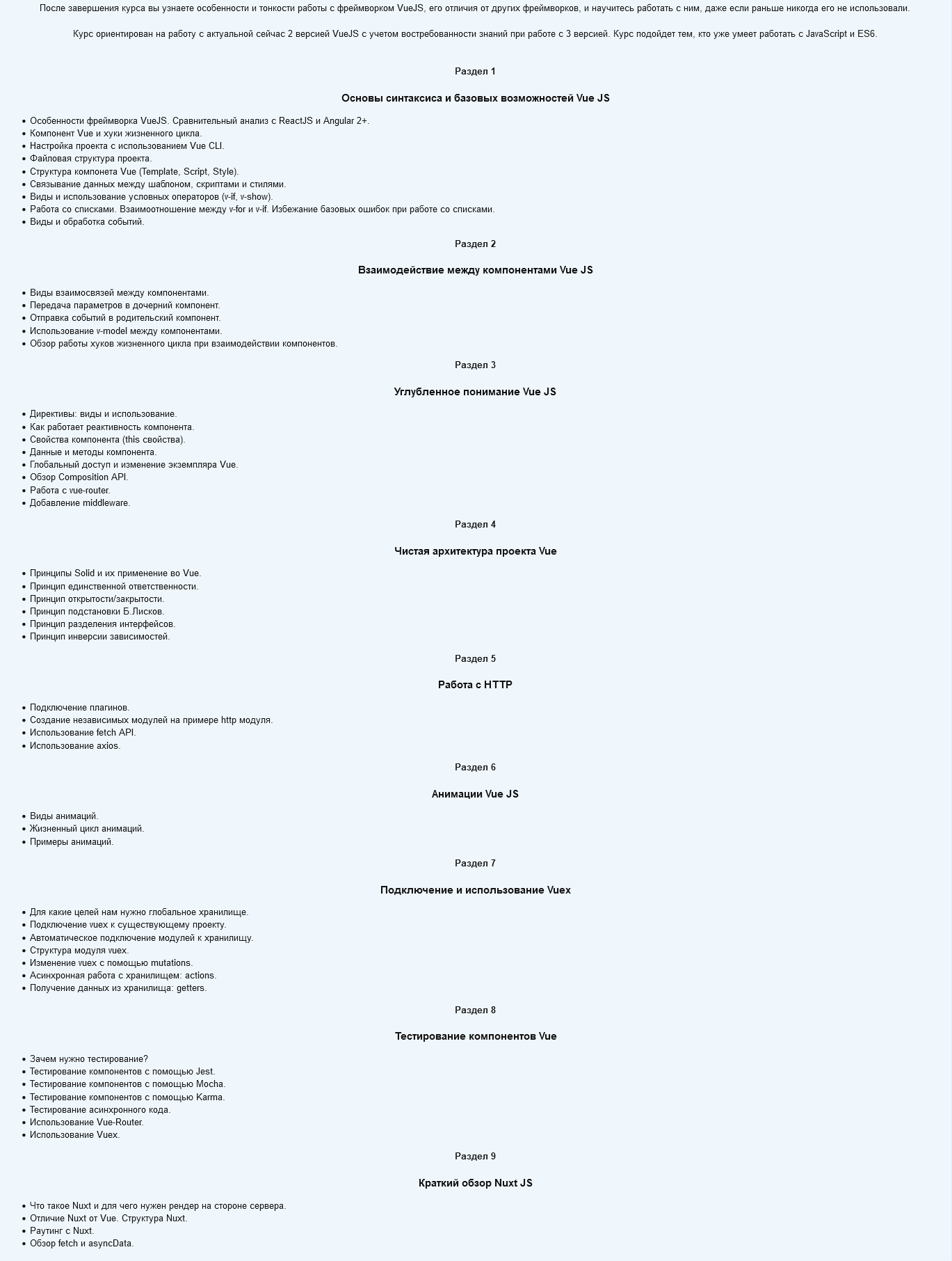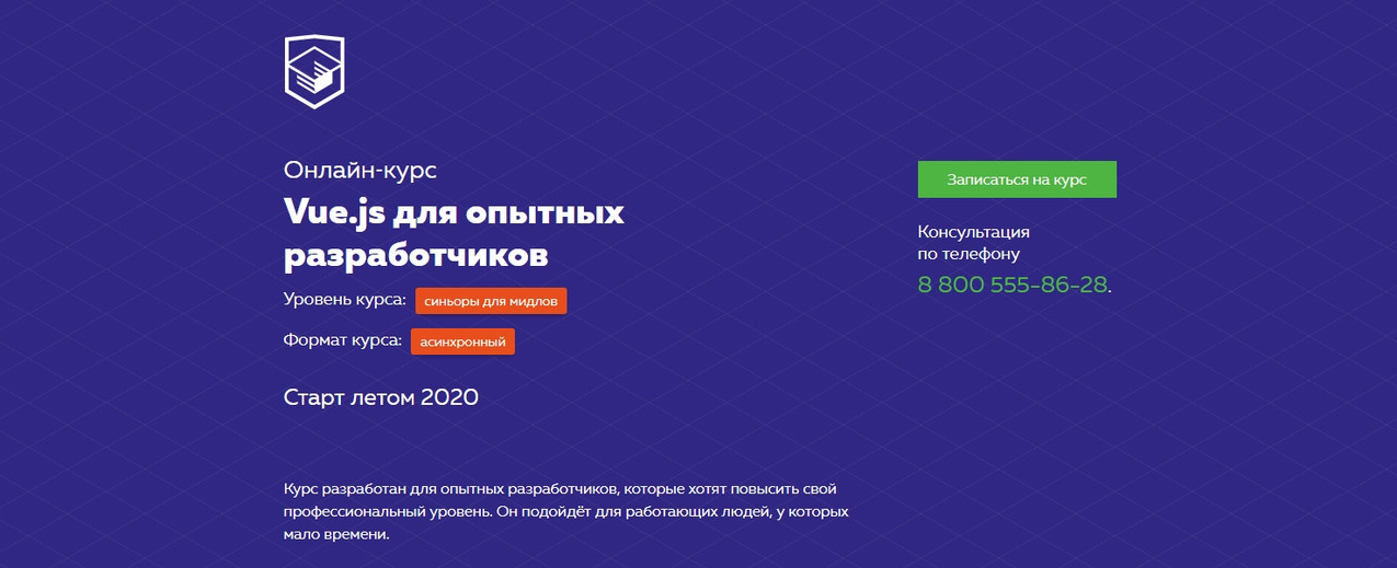 После завершения курса вы узнаете особенности и тонкости работы с фреймворком VueJS, его отличия от других фреймворков, и научитесь работать с ним, даже если раньше никогда его не использовали. Курс ориентирован на работу с актуальной сейчас 2 версией VueJS с учетом востребованности знаний при работе с 3 версией. Курс подойдет тем, кто уже умеет работать с JavaScript и ES6.